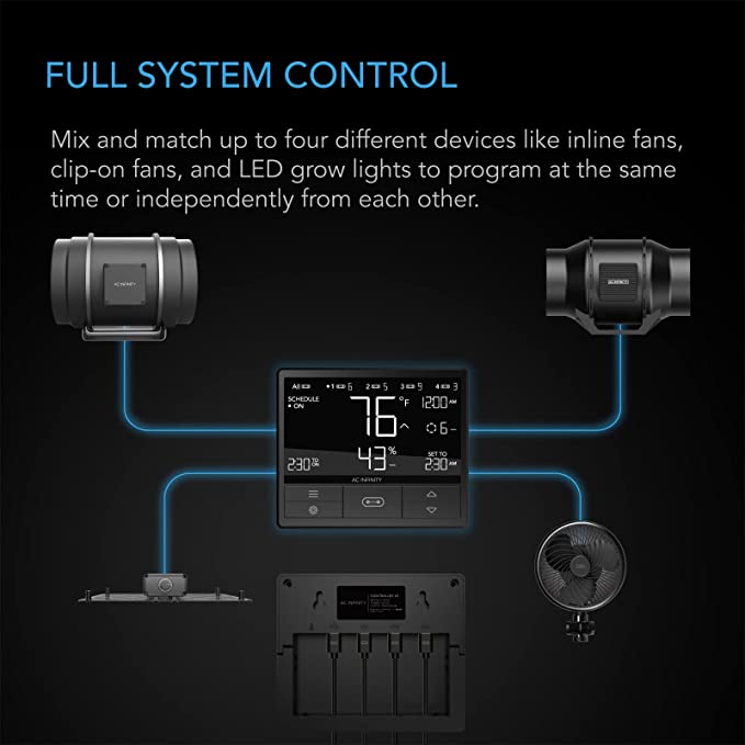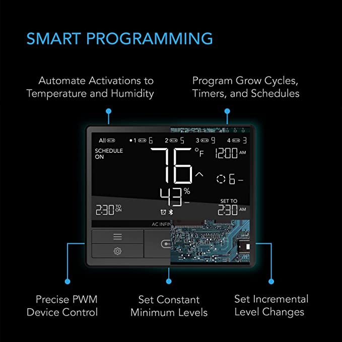 Join up to four gadgets and give them access to the same or separate content. Set dynamic programmes that adjust fan speed and light intensity in response to changing temperature and humidity, going beyond simple on/off triggering. Establish a minimum level at which your devices will operate continuously; these settings will be used unless a trigger is triggered. For a wide range of indoor gardening purposes, the timer, cycle, and schedule modes provide convenient on-demand activation. Using Bluetooth and the AC Infinity app, you can securely connect to your devices from a distance, unlock advanced programming features, receive alerts and notifications, examine graphs of past data, and even export this information as a CSV file.