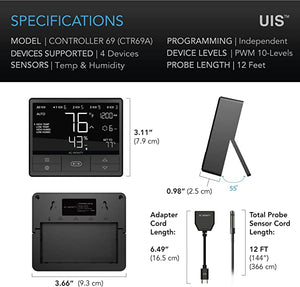 A controller built for the next generation, one that can intelligently programme AC Infinity devices for maximum efficiency. This control hub communicates with up to four devices, such as fans or lights, to give each one its own temperature and time schedule. The temperature can be displayed in either Fahrenheit or Celsius on the backlit display, which can be turned off to conserve power when background processes are active. This product is part of the UIS platform of grow devices and smart controllers that are meant to work together to create your ideal environment, and its 12-foot sensor probe with thermal-alloy head accurately detects current temperature and humidity conditions.
